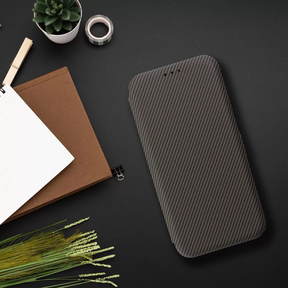 A Folio Side Magnet tok tartós műbőrből készült. Felületét elegáns karbon mintázat díszíti, amely kiemeli a készülék modern karakterét. A közepes rugalmasság megfelelő védelmet és kényelmes használatot biztosít.